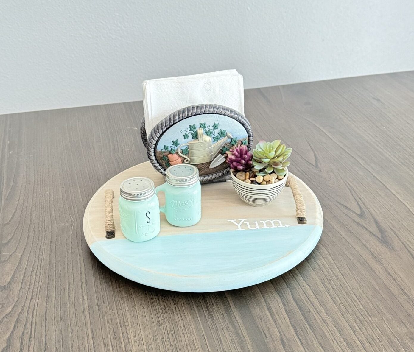 Use painter’s tape to visually divide the tray. You can paint half the circle, create a stripe, or place your painted section wherever it looks best with your chosen handles and SVG design.